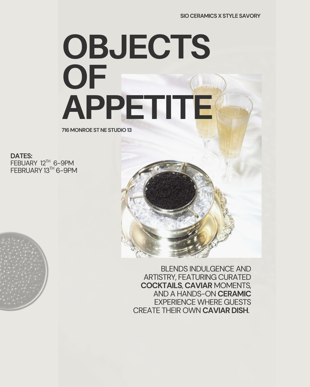 Objects of Appetite is an intimate, art-forward evening where indulgence becomes experience and taste becomes form. Guests are welcomed into a refined atmosphere featuring curated cocktails, caviar moments, and a hands-on ceramic workshop focused on creating a one-of-a-kind caviar dish.